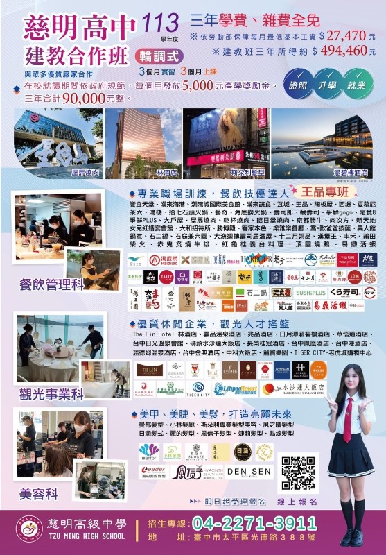 一、活動時間:113年3月30日(六)0800~1200時。二、活動特色:(一)全校師生敬邀各國中師生及家長來校,共同祈願『智慧、勇氣、健康、平安』,共植智慧。(二)規劃餐飲管理、餐飲技術、烘焙食品、美顏技術、資訊、電子商務、照顧服務科體驗活動,計有蛋糕裝飾、直播體驗、創意焊接、彩繪課程、彭祖體驗等。三、地點:聖露大樓。四、本校現為中部地區建教人數及合作廠家最多高中,在校期間表現優異,每年6個月另有每月5000元獎勵金,畢業直接銜接科技大學,歡迎對建教班(三個月讀書、三個月實習)有意願同學加入或洽詢。五、訂於4月13日(六),辦理建教王品專班面試、4月27日(六),辦理建教餐飲管理、觀光事業、美容班面試。名額有限,報名請早。六、聯繫人:教務處主任丁茂栓、電話:04-22713911分機101。檢附資料:一、二、三