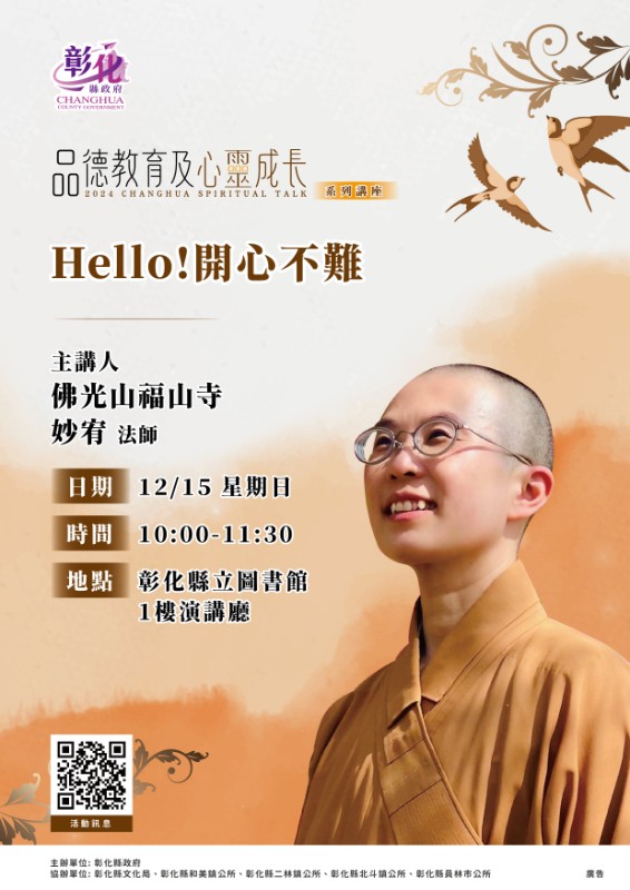 旨揭講座訂於113年12月15日(星期日)10時至11時30分於彰化縣立圖書館1樓演講廳由佛光山福山寺妙宥法師主講「Hello!開心不難」。 |