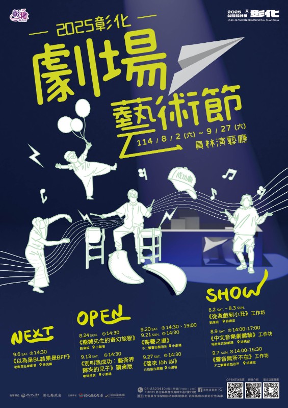 一、依據彰化縣文化局114年7月18日彰文南字第1140008811號函辦理。 二、本縣文化局為厚植地方藝文生命力、推廣優質表演藝術節目,今(114)年自8月2日至9月27日於員林演藝廳辦理「2025彰化劇場藝術節」,邀請國內外優質團隊帶來5檔精彩演出、3檔工作坊及1場演後座談;演出包含丑戲、音樂劇、讀劇、擊樂及新創舞作,工作坊則有丑劇即興、音樂劇體驗、聲響創作等。 三、提供本縣立各級學校教職員購票優惠如下: (一)7月31日(星期四)前購票,不限票價、不限張數享早鳥75折優惠。 (二)8月1日(星期五)後購票,輸入優惠代碼25gpfm,享9折優惠。 (三)身心障礙人士及陪同者1名、65歲以上長者,購票享5折優惠(入場時應出示證明文件)。 (四)13-22歲青年使用文化幣購買青年席位另有優惠(入場時應出示證明文件)。 四、購票請至OPENTIX 兩廳院文化生活售票系統(https://reurl.cc/x3gdxe)或員林演藝廳服務台(電話:04-8323410分機213);更多節目資訊及優惠詳情,請上員林演藝廳官網(https://gov.tw/ajU)查詢。 五、檢附「2025彰化劇場藝術節」活動海報1份供參閱