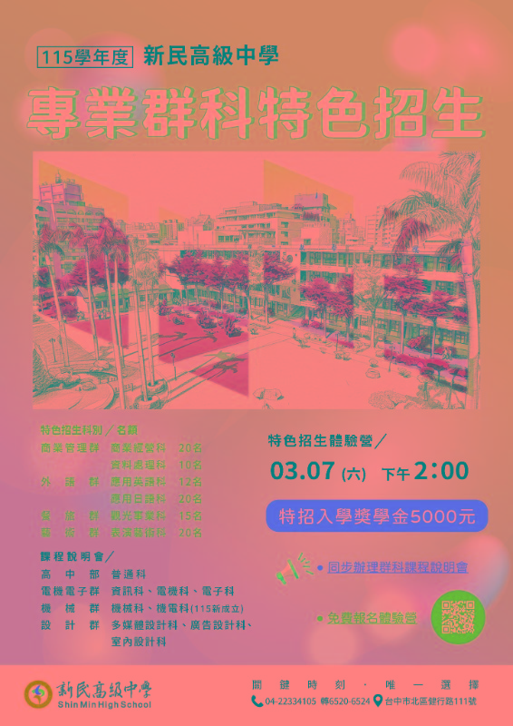 轉知:臺中市私立新民高級中學115學年度特色招生專業群科甄選入學簡章及特色招生DM一份 |
