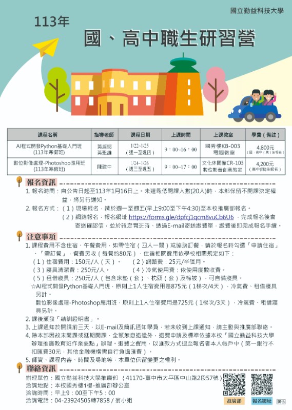 說明:一、 「AI 程式開發python 基礎入門班(113年寒假班)」課程期間:113年1月22日至113年1月25日;「數位影像處理-Photoshop應用班(113年寒假班)」課程期間:113年1月24日至113年1月26日。二、 報名日期:即日起至113年1月16日止。三、 「AI 程式開發python 基礎入門班(113年寒假班)」招生對象:國中學生(國一至國三學生)及高中職學生(高一至高三學生);「數位影像處理-Photoshop應用班(113年寒假班)」招生對象:高中職學生(高一至高三學生)。四、 旨揭課程資訊可至本校推廣部網站(https://eeo.ncut.edu.tw/index.php)查詢,報名網址(https://forms.gle/dpfcj1qcm8vuCb6U6)。五、 相關課程洽詢電話:04-23924505分機7858,推廣部翁小姐。