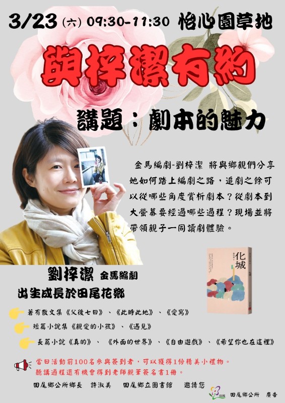 轉知: 田尾鄉公所訂於113年3月23日(星期六)上午9時30分假本鄉怡心園草地辦理「與梓潔有約-草地講堂」,歡迎踴躍參加。 |