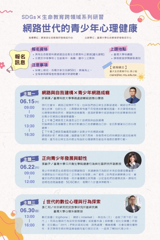 轉知:檢送本校辦理「SDGs×生命教育跨領域系列研習-網路世代的青少年心理健康」簡章,請踴躍參加。