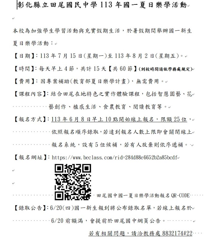 | 標題 | 再次公告:113學年度田尾國中-國一新生6/20報到事項、編班時程及「國一夏日樂學活動報名」說明 |