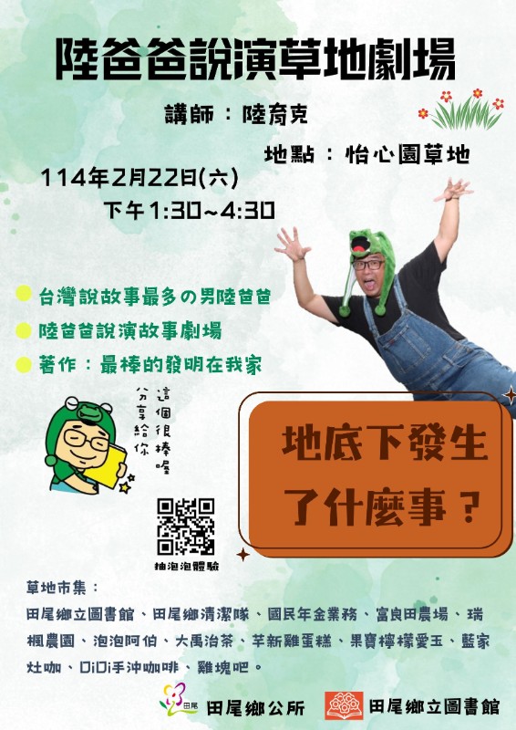 轉知: 田尾鄉公所訂於114年2月22日(星期六)下午1時30分假本鄉怡心園草地辦理「陸爸爸說演故事劇場-《地底下發生什麼事?》」,歡迎踴躍參加 |