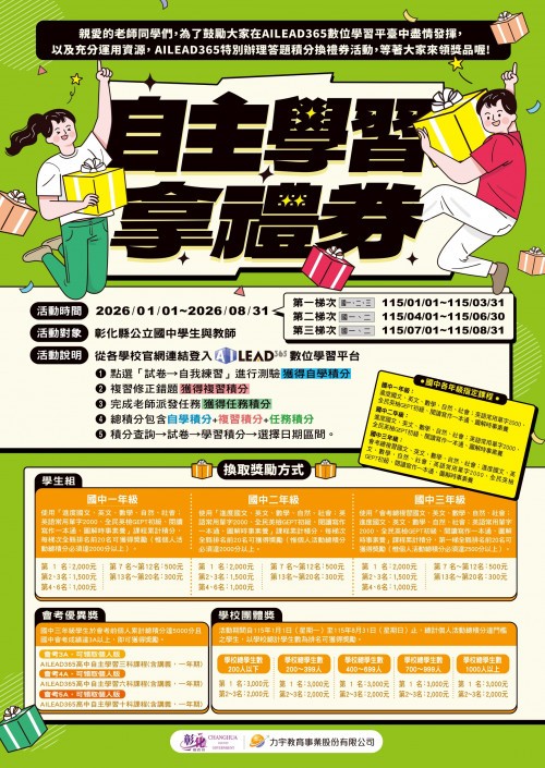 說明: 一、依據教育部「推動中小學數位學習精進方案」114年國民中小學實施計畫辦理。 二、本府採購全縣公立國中師生「AILEAD365」學習平臺1年授權,為推廣各校善用該軟體,爰規劃旨揭活動,鼓勵學生自主學習提升學科知能。 三、活動資訊: (一)期程:115年1月1日起至8月31日止,獎勵區間分為三梯次。 (二)對象:本縣公立國中學生。 (三)活動方式:學生自各校專屬的【AILEAD365線上學習平臺】網站登入,練習指定課程答題(含自學、老師任務、複習),即可獲得積分。 (四)將依學生個人活動累計積分,分梯次與年級進行排名與禮券獎勵。 (五)除個人獎勵外,另提供會考優異獎與學校團體獎。 四、詳細活動說明請參閱附件計畫。請鼓勵貴校學生踴躍參加。 五、如有未盡事宜,請逕洽本縣數位學習推動辦公室,04-7237182#24。