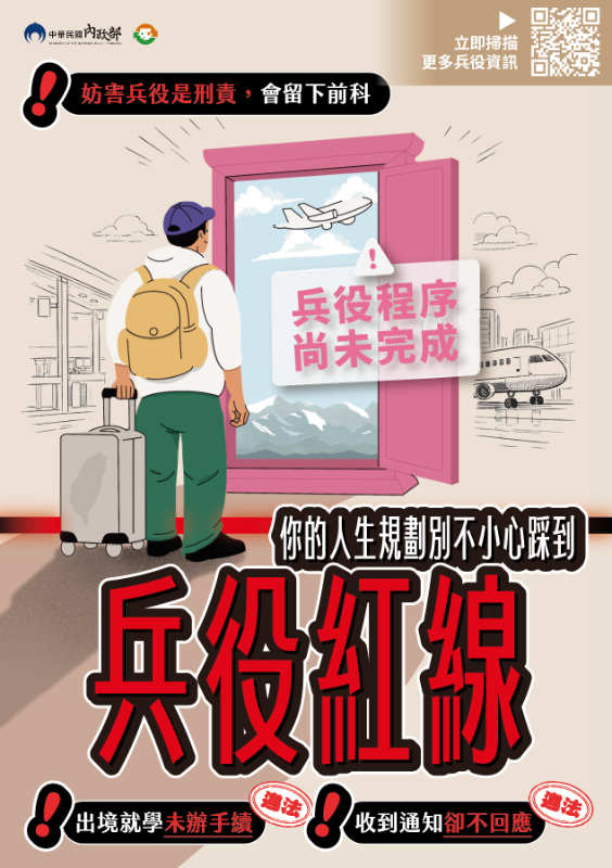 說明: 一、依109年至114年統計資料顯示,妨害兵役案件中,以「經催告仍未返國,致未能接受徵兵處理或徵集者」為最常見類型,其比例高達61%,此類案件多屬當事人對妨害兵役相關規定認知不足所致。究其原因,現行兵役制度之宣導多集中於役男接近服役年齡階段,就學期間之學生及家長接觸妨害兵役相關法令資訊相對有限,顯示宣導時點確有提前之必要。 二、檢附妨害兵役防制向下扎根之宣導策略與推動作法文字檔及簡報檔。 |