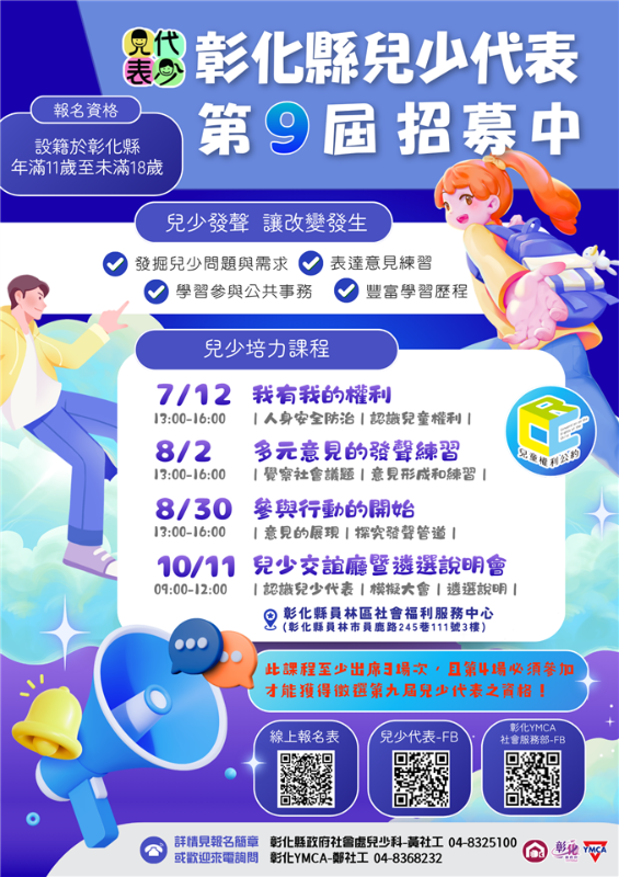 本活動資訊亦同步公告於彰化縣政府社會處網站(路徑:社會處網站-兒少福利專區-彰化縣兒童及少年代表)。 |