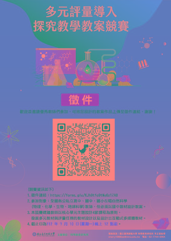 轉知: 臺灣師範大學科學教育研究所許瑛玿教授執行之教育部國民及學前教育署「多元評量嵌入教學以促進科學學習表現與數位學習能力計畫-強化教材研發實踐社群運作與分享機制」計畫,辦理「多元評量導入探究教學教案競賽」徵稿 |