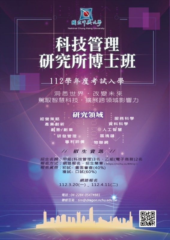 轉知國立中興大學科技管理研究所112學年度博士班招生入學考試資訊