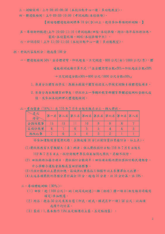 五、專項術科甄選:上午10:00~11:10 (考試地點:田徑-本校操場、游泳-海洋森林游泳池、 籃球-本校籃球場、網球-本校操場中央) 。 六、口試時間:上午11:20~11:50 (本校活動中心一樓:多功能教室)。