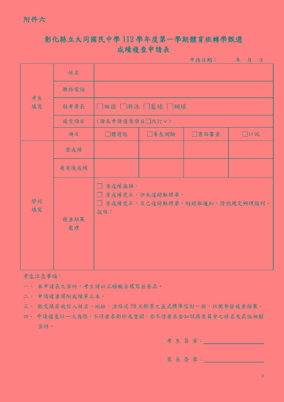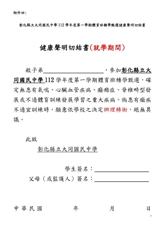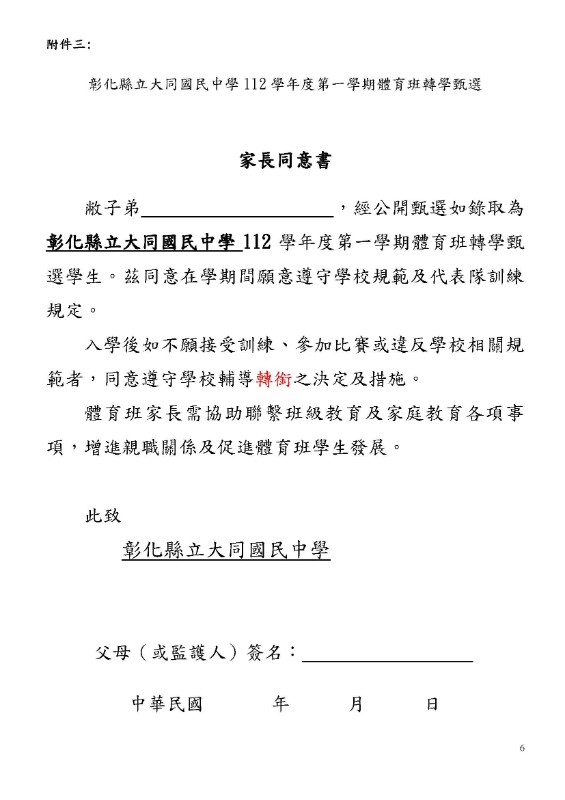 彰化縣立大同國民中學112學年度第一學期體育班轉學甄選簡章 壹、依據: