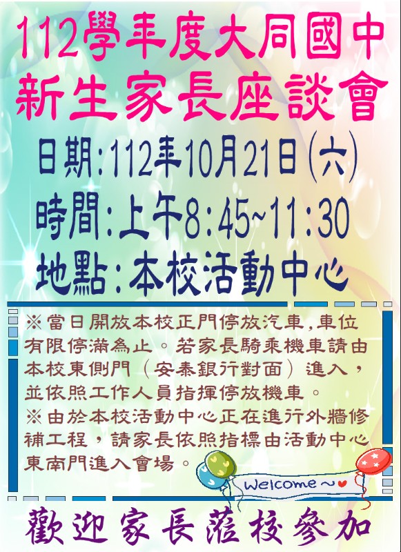 | 標題 | 本校於112年10月21日(六)上午辦理「新生家長座談會」,歡迎七年級家長踴躍參加! |