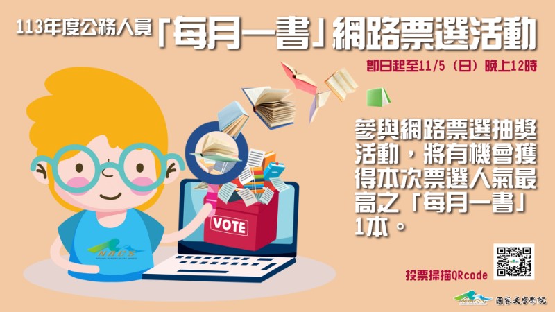 說明:一、依據國家文官學院112年10月11日國院數字第1120800159號函辦理。二、為倡導閱讀風氣及廣納多元意見,公務人員「每月一書」遴選加入「網路票選」機制,邀請公務人員自兩大領域決審圖書進行投票。三、網路票選活動說明如下:(一)網路票選時間:即日起至112年11月5日(星期日)晚上12時。(二)活動對象:公務人員。(三)活動連結: https://gov.tw/vB5。(四)票選方式:「公共政策與管理知能」及「自我發展與人文關懷」兩大領域各12本圖書,每領域可複選圈選1至6票。(五)獎勵措施:自全體參與票選活動參加者中,以電腦隨機抽出50名得獎者,致贈得票數最高之「每月一書」圖書1本,預定於112年11月21日公告抽獎結果。四、檢附國家文官學院原函影本及相關附件各1份。