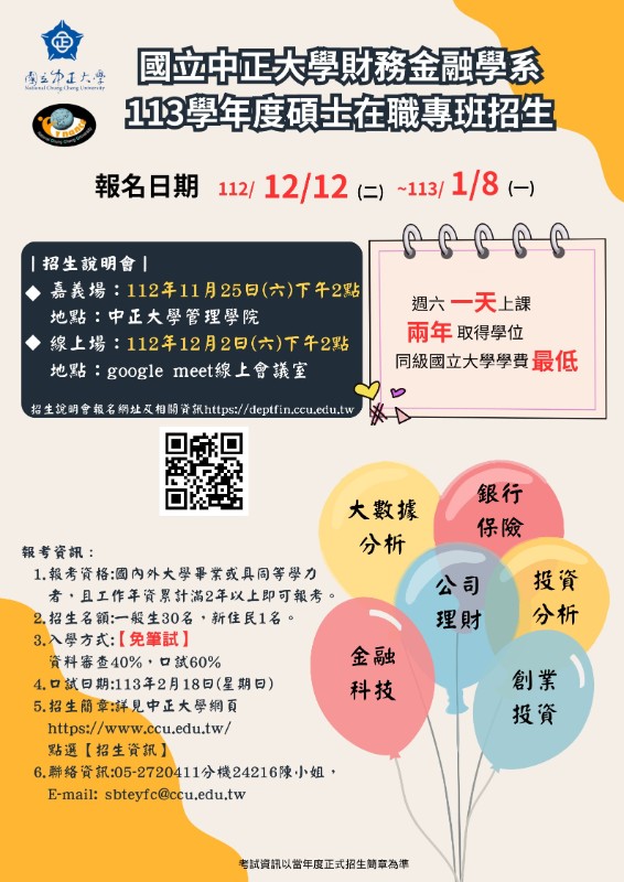 轉知國立中正大學財務金融學系碩士在職專班113學年度招生宣傳資訊