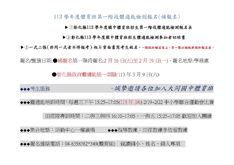 本校招收項目:田徑、游泳、網球 第一階段體適能檢測補報名日期:113年2月16日~113年2月19日(大同國中學務處體育組) 第一階段體適能檢測日期:113年3月9日星期六(彰化縣立體育場) 第一階段體適能檢測,要達到70分(含)以上,方可報名第二階段學校專項術科考試。 一定要先參加第一階段才能報考第二階段專項術科考試。 有任何疑問,歡迎撥打:04-8358382(轉340體育組)
