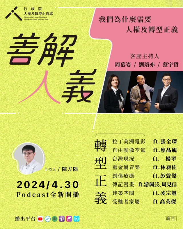 | 標題 | 轉知行政院人權及轉型正義處製作Podcast節目「善解人義─我們為什麼需要人權及轉型正義」於113年4月30日開播 |