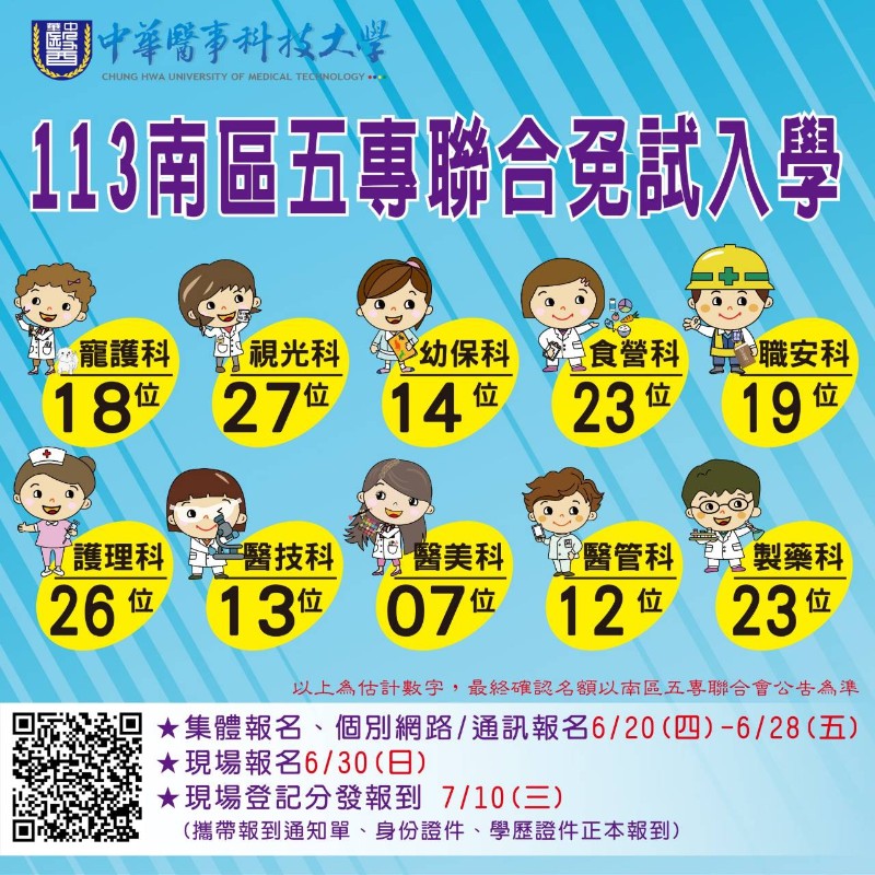 中華醫事科大五專聯合免試入學管道相關資訊 一、鼓勵畢業生以南區五專聯合免試入學管道報考華醫五專學制,報考時間:06/20(四) ~ 06/28(五)。 醫事檢驗生物技術科、護理科、生物醫學及美容保健科、視光科、製藥工程科、職業安全衛生科、食品營養科、幼兒保育科 醫務暨健康事業管理科、寵物照護與美容科等十科。 四、113學年度本校在南區五專聯合免試入學各科招收名額如附件. 五、若有任何入學疑問,請洽詢入學招生專線:06-3362469 |