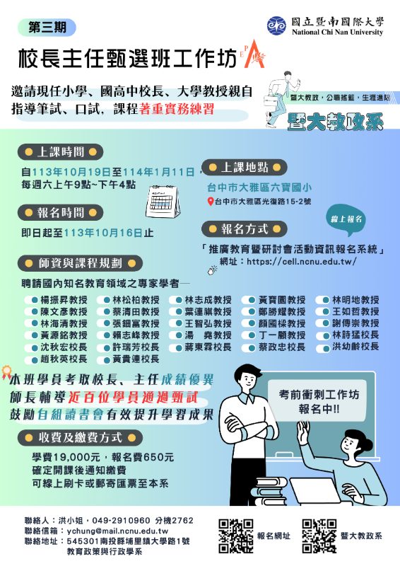 轉知國立暨南國際大學第三期中小學校長主任甄選班工作坊招生資訊