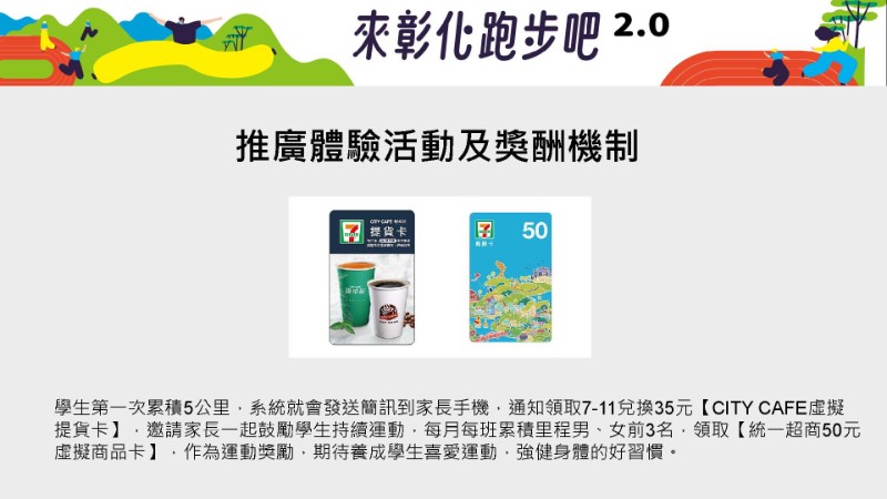 學生第一次累積5公里,系統就會發送簡訊到家長手機,通知領取7-11兌換35元【CITY CAFE虛擬提貨卡】,邀請家長一起鼓勵學生持續運動。