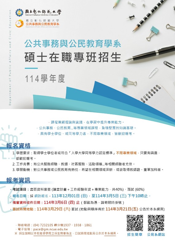 轉知國立彰化師範大學公共事務與公民教育學系114學年度碩士在職專班招生資訊