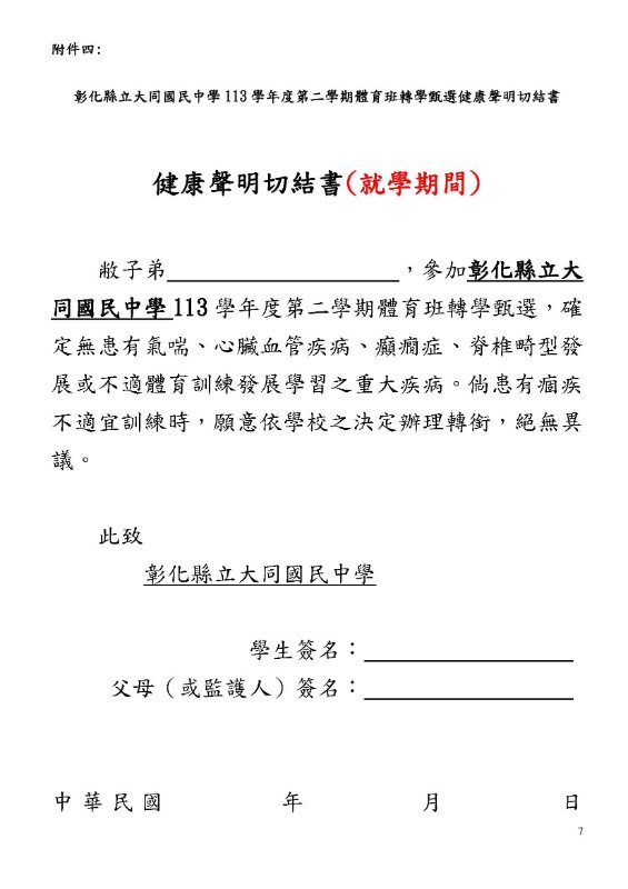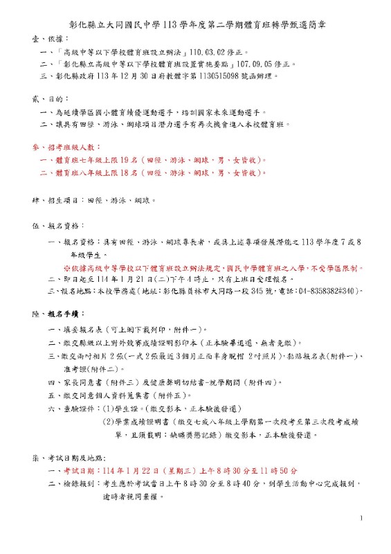 彰化縣立大同國民中學113學年度第二學期體育班轉學甄選簡章 壹、依據: 一、「高級中等以下學校體育班設立辦法」03.02修正。 二、「彰化縣立高級中等以下學校體育班設置實施要點」09.05修正。 三、彰化縣政府113年12月30日府教體字第1130515098號函辦理。