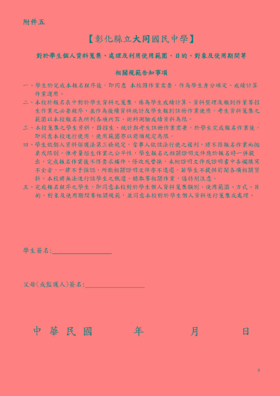 陸、報名手續: 一、填妥報名表(可上網下載列印,附件一)。 二、繳交縣級以上對外競賽成績證明影印本(正本驗畢退還、無者免繳)。 三、繳交兩吋相片2張(一式2 張最近3 個月正面半身脫帽 2 吋照片),黏貼報名表(附件一)、 准考證(附件二)。 四、家長同意書(附件三)及健康聲明切結書-就學期間(附件四)。 五、繳交同意個人資料蒐集書(附件五)。 六、查驗證件:(1)學生證。(繳交影本,正本驗後發還) (2)學業成績證明書(繳交七或八年級上學期第一次段考至第三次段考成績 單,且須載明:缺曠獎懲記錄)繳交影本,正本驗後發還。