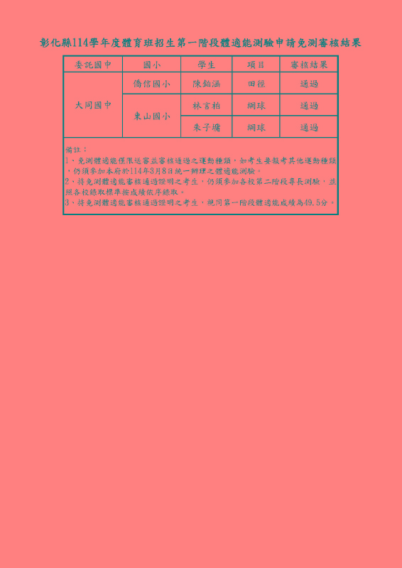 申請114學年度國中體育班免測第一階段體適能測驗學生名單,審核結果如附件,請查照。
