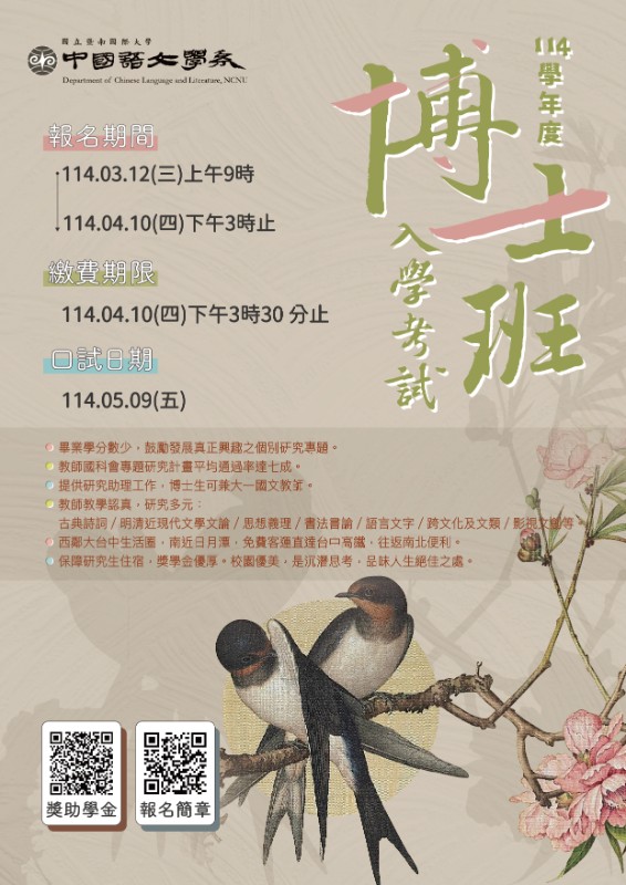 轉知國立暨南國際大學中國語文學系114學年度博士班入學考試報名資訊