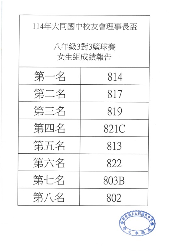 【體育組公告】114年大同國中校友會理事長盃 八年級3對3籃球賽 女生組 比賽結果公告