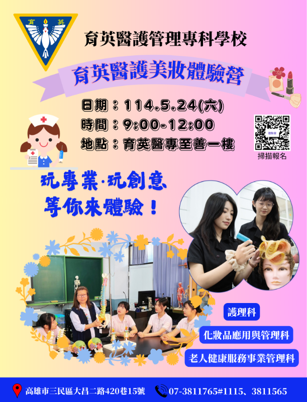 一、為協助九年級學生及家長更了解五專技職教育優勢及特色,獲得完整之技職教育升學進路與未來職涯發展資訊,本校特舉辦「育英醫護美妝體驗營」。