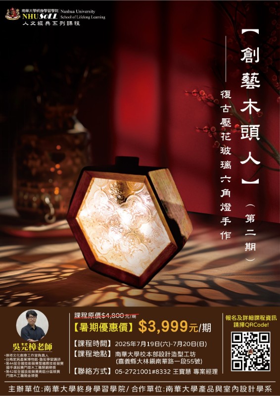 轉知南華大學114年7月份開辦之【創藝木頭人】-第二期 復古壓花玻璃六角燈手作課程資訊
