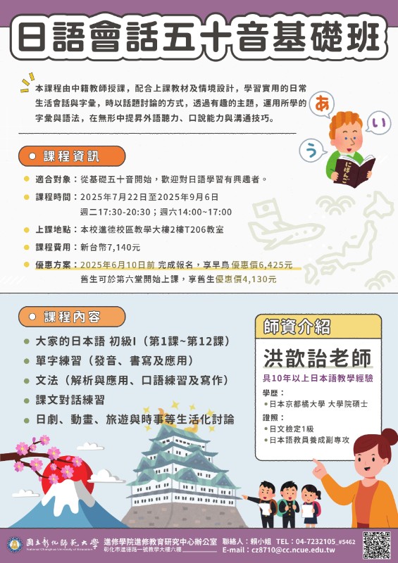 轉知國立彰化師範大學進修學院推廣教育課程「日語會話五十音基礎班」課程簡章