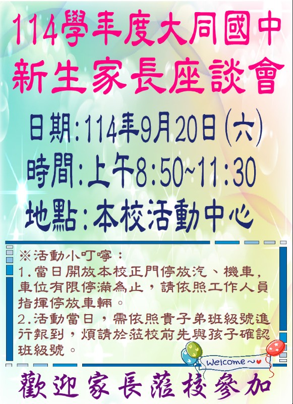 本校將於9月20日(六)上午舉辦七年級新生家長座談會,藉此讓家長深入了解學校的辦學理念與課程特色,認識導師的班級經營方式,並掌握孩子在校園中的適應情形。誠摯邀請家長踴躍參與,攜手為孩子打造更完善的學習環境,共同關心孩子的成長與發展。