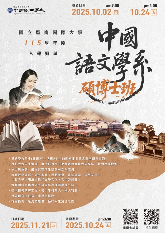 | 標題 | 轉知國立暨南國際大學中國語文學系115學年度碩、博士班入學甄試報名資訊 |