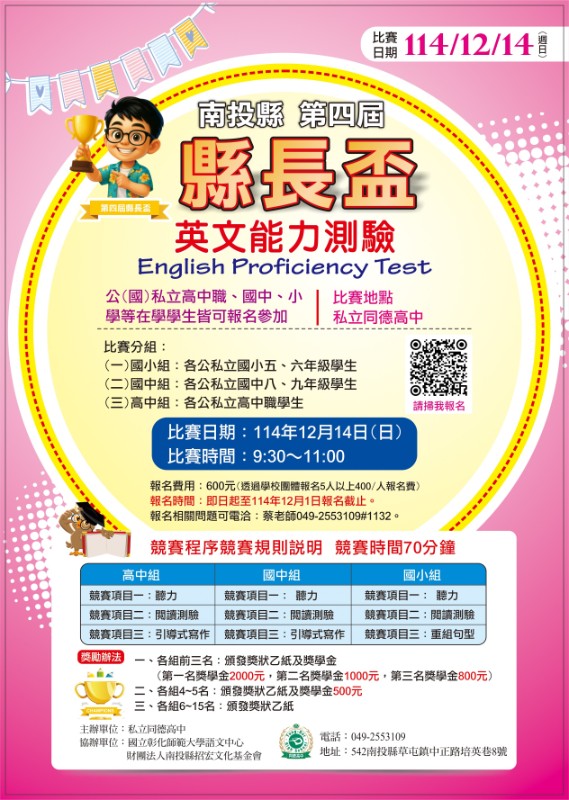 轉知:南投縣第四屆縣長盃中小學生英文能力比賽計畫,鼓勵學生踴躍參加。