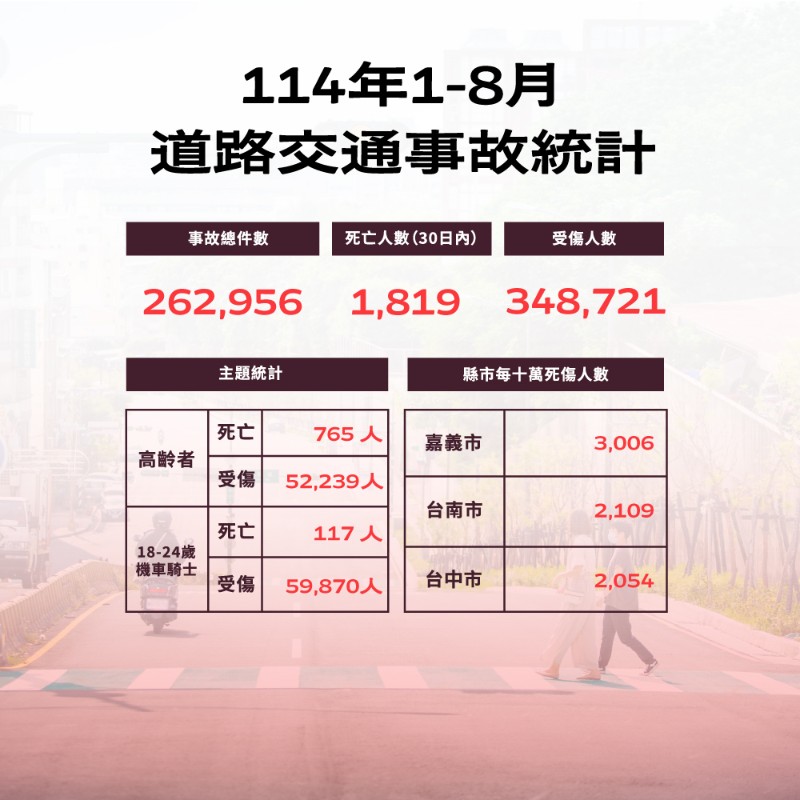 | 標題 | 本縣114年1-8月道路交通事故死傷累計20,913人,詳細情況如下列圖表呈現。 |