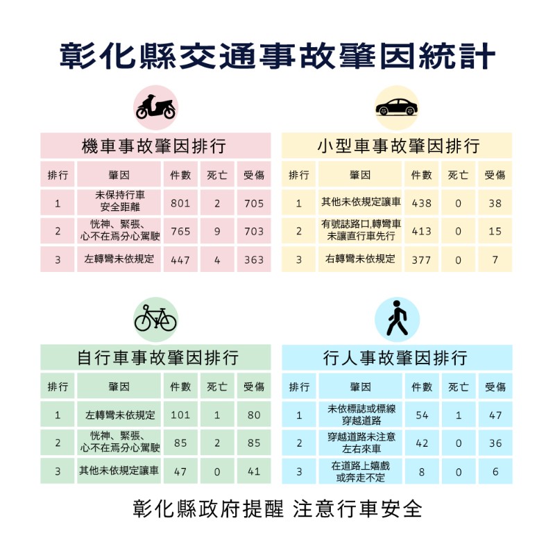 根據交通部道安資訊查詢網,本縣114年1-8月道路交通事故與112年同期比較分析,以少年自行車騎士(含電自、電輔) 事故增加39.5%最高,外籍人士事故增加34.3%次之,自小客車駕駛人增加24.7%再次之。1-8月份30日鄉鎮市每千人死傷人數於「彰化市、員林市、二林鎮」為多,肇事熱點以「彰化市」為多。 |