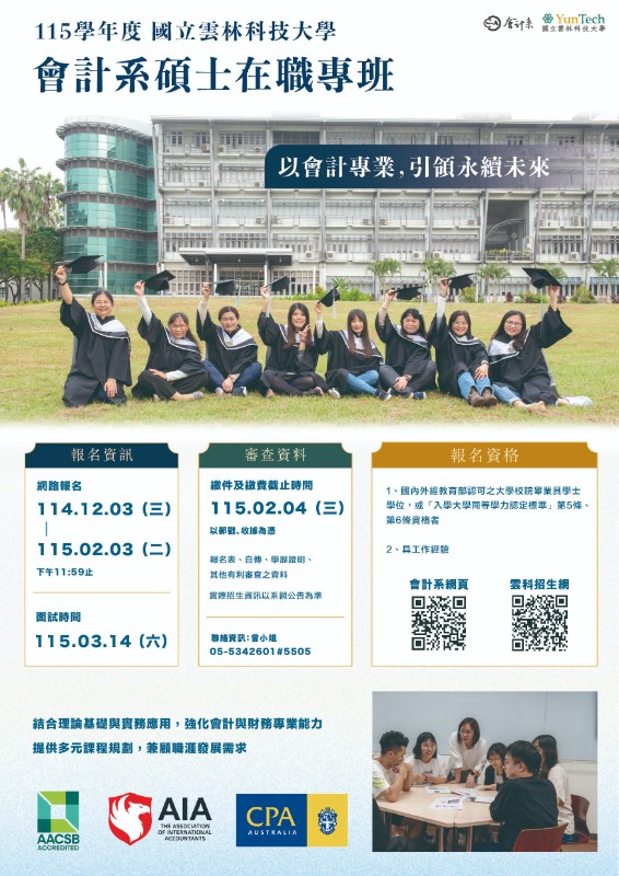 轉知國立雲林科技大學會計系115學年度碩士在職專班招生資訊