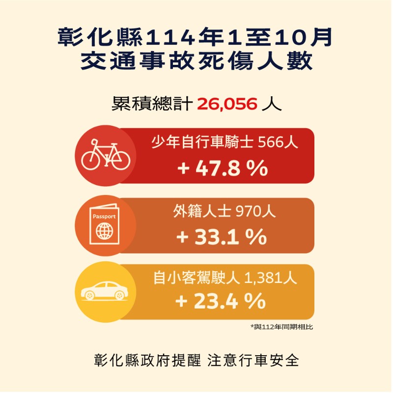 本縣114年1-10月道路交通事故死傷累計26,056人,詳細情況如下列圖表呈,願民眾注意交通安全,共同降低死傷人數。