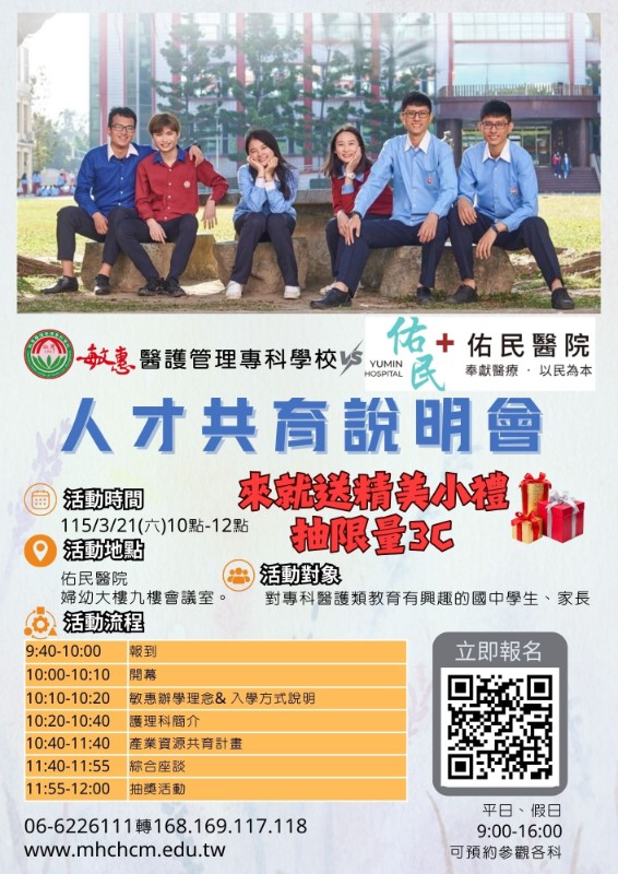 | 標題 | 轉知 敏惠醫專與南投縣佑民醫院舉辦之人才共育暨五專入學說明會 |