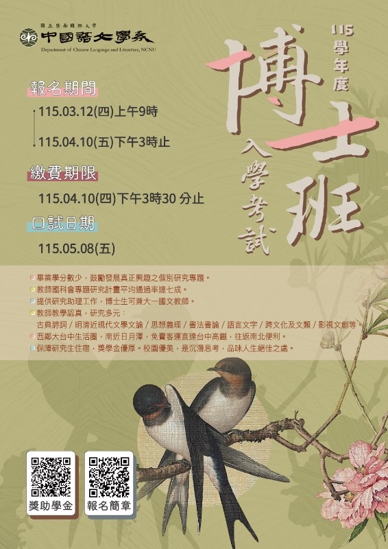 轉知國立暨南國際大學中國語文學系115學年度博士班入學考試資訊