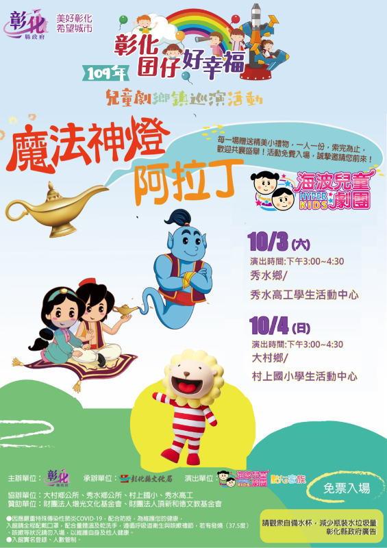 彰化縣政府「彰化囝仔好幸福─109年兒童劇鄉鎮巡演活動」,10/3(六)下午3點在秀水鄉/秀水高工學生活動中心,「海波兒童劇團」演出《魔法神燈阿拉丁及奶油獅》。