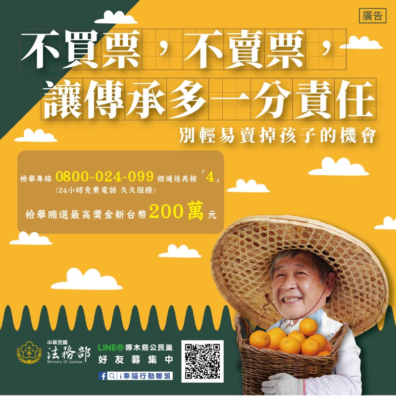 主旨: 為辦理「110年農漁會選舉反賄選宣導活動」,請貴校協助以多元方式進行宣導,請查照。 有關旨揭選舉反賄選宣導文宣(如廣播、海報、圖卡、懶人 包等宣導素材)及影片,業已置放於法務部網站-下載專區-宣導資料下載(連結:https://www.moj.gov.tw/lp-412-001.html)及網路平台(連結:https://drive.google.com/ drive/folders/1vG5V71j8dP7xKLwdTWPplJaaIpavB8W4),請下載參考運用。
