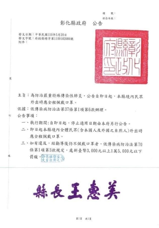 | 標題 | 彰化縣政府1100520公告:為防治嚴重特殊傳染性肺炎,公告自即日起,本縣境內民眾外出時應全程配戴口罩。 |