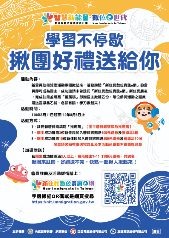 內政部移民署辦理之新住民數位應用資訊計畫「學習不停歇、揪團好禮送給你」新會員註冊活動