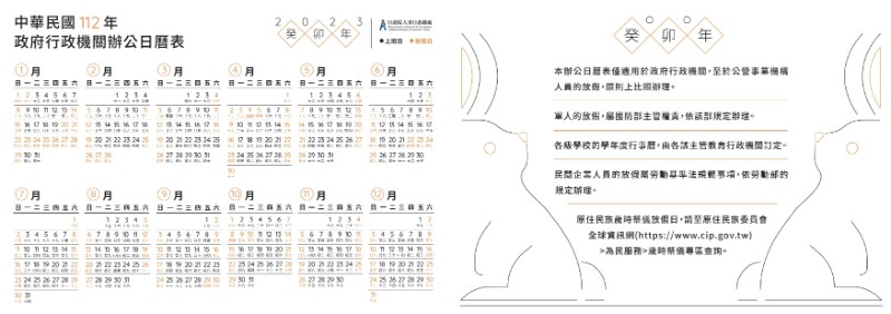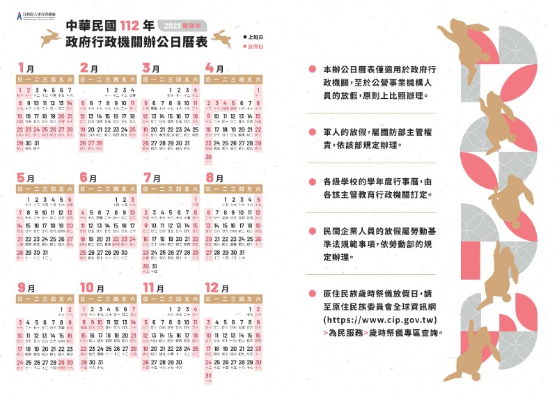 112年政府行政機關辦公日曆表 行政院人事行政總處業於全球資訊網之「辦公日曆表」專區(https://www.dgpa.gov.tw/)提供多元設計圖樣之辦公日曆表圖檔,如有需要,請自行下載使用。