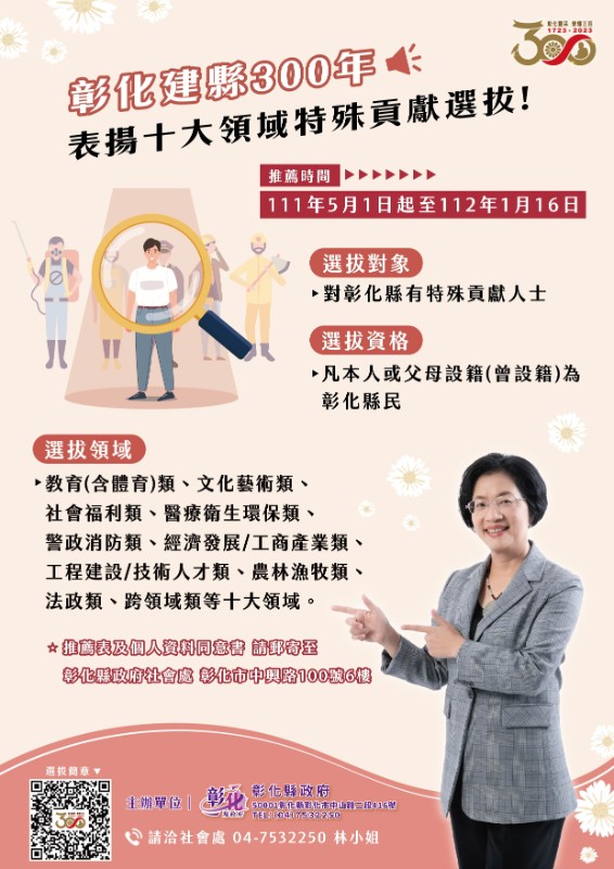 | 標題 | 「彰化建縣300 年 -表揚十大領域特殊貢獻選拔活動」延長收件至112年1月16日,請踴躍推薦特殊貢獻(跨領域類)之人士。 |