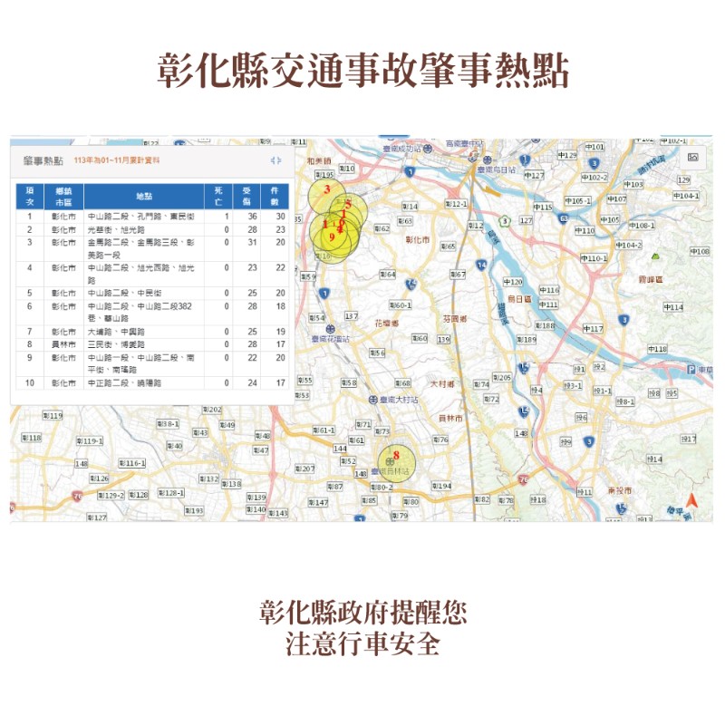 轉知本縣113年1至11月道路交通事故死傷累計27,916人,多加留意交通安全。
