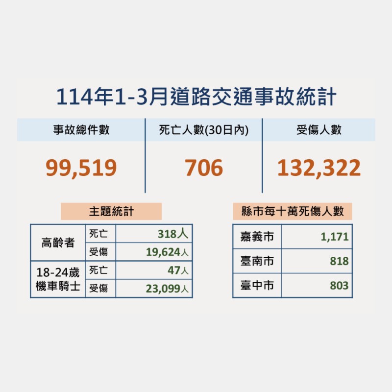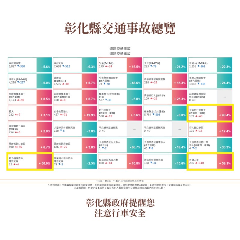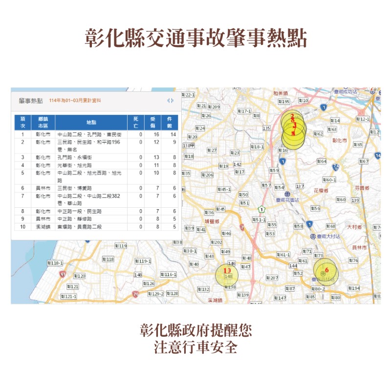 本縣114年1-3月道路交通事故死傷累計7,668人,請多加留意交通安全。